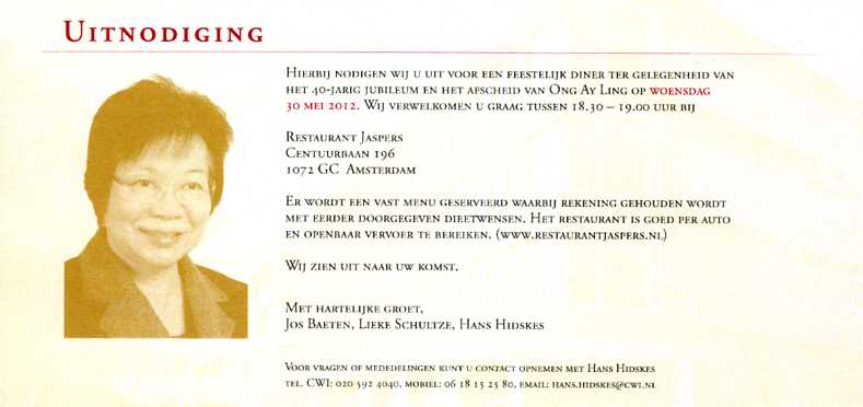 Uitnodiging etentje t.g.v. afscheid van Ay Ong, 30.05.2012